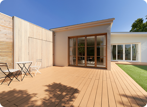 お茶を楽しんだり、お子さまの遊び場にしたり、外でもくつろげるウッドデッキ。第2のリビングとして人気です。